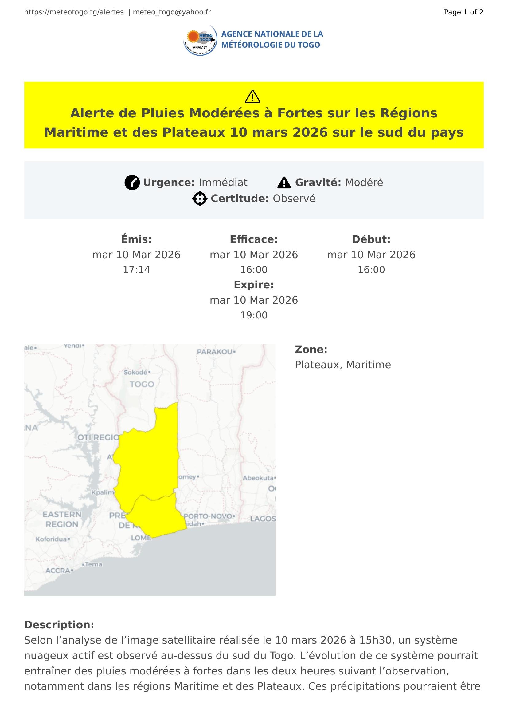 Alerte de Pluies Modérées à Fortes sur les Régions Maritime et des Plateaux 10 mars 2026 sur le sud du pays
