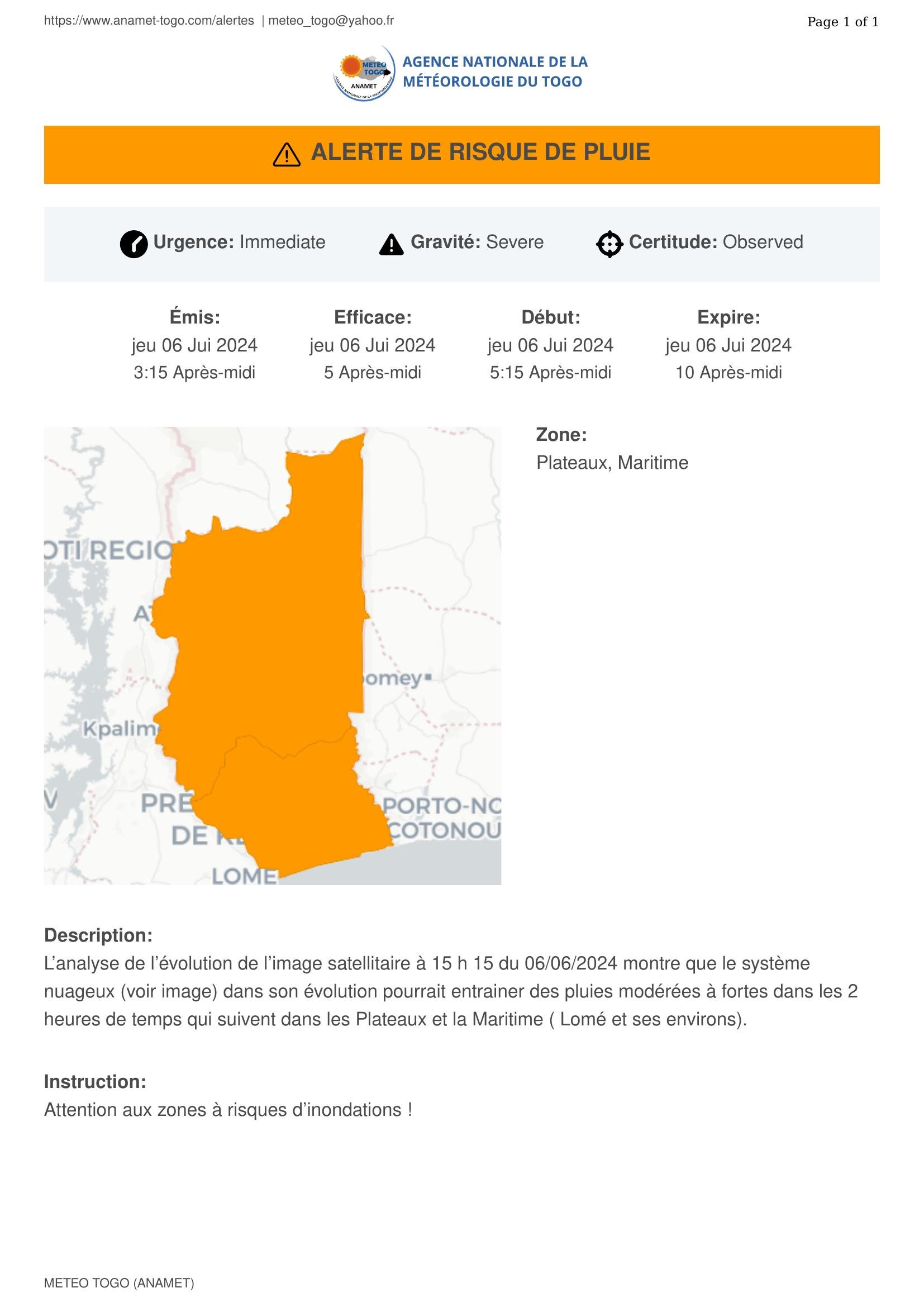 L’analyse de l’évolution de l’image satellitaire à 15 h 15 du 06/06/2024 montre que le système nuageux (voir image) dans son évolution pourrait entrainer des pluies modérées à fortes dans les 2 heures de temps qui suivent dans les Plateaux et la Maritime ( Lomé et ses environs).