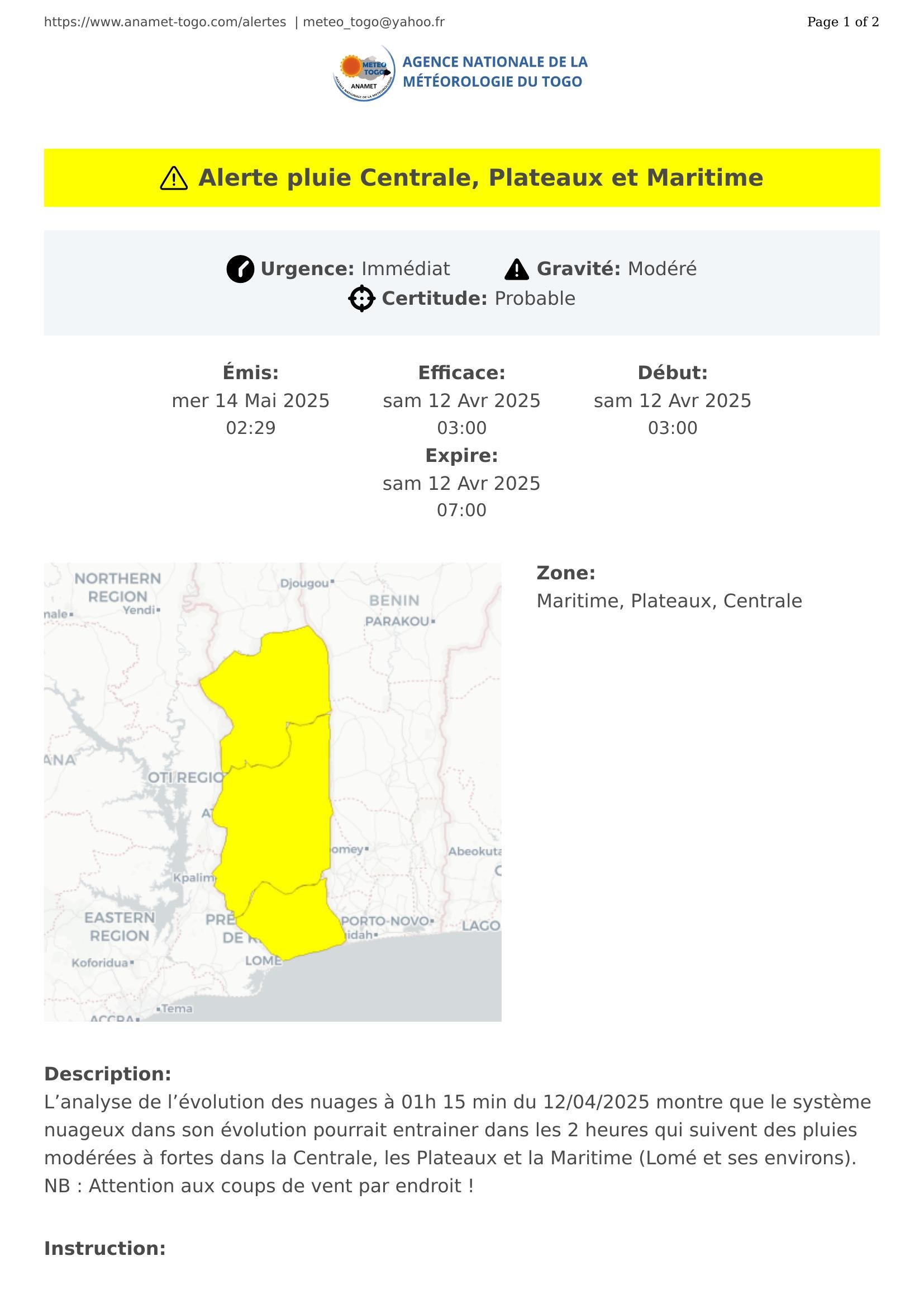 ULLETIN METEOROLOGIQUE D’ALERTE DE RISQUE DE PLUIE DU 12 AVRIL 2025 SUR LE TOGO