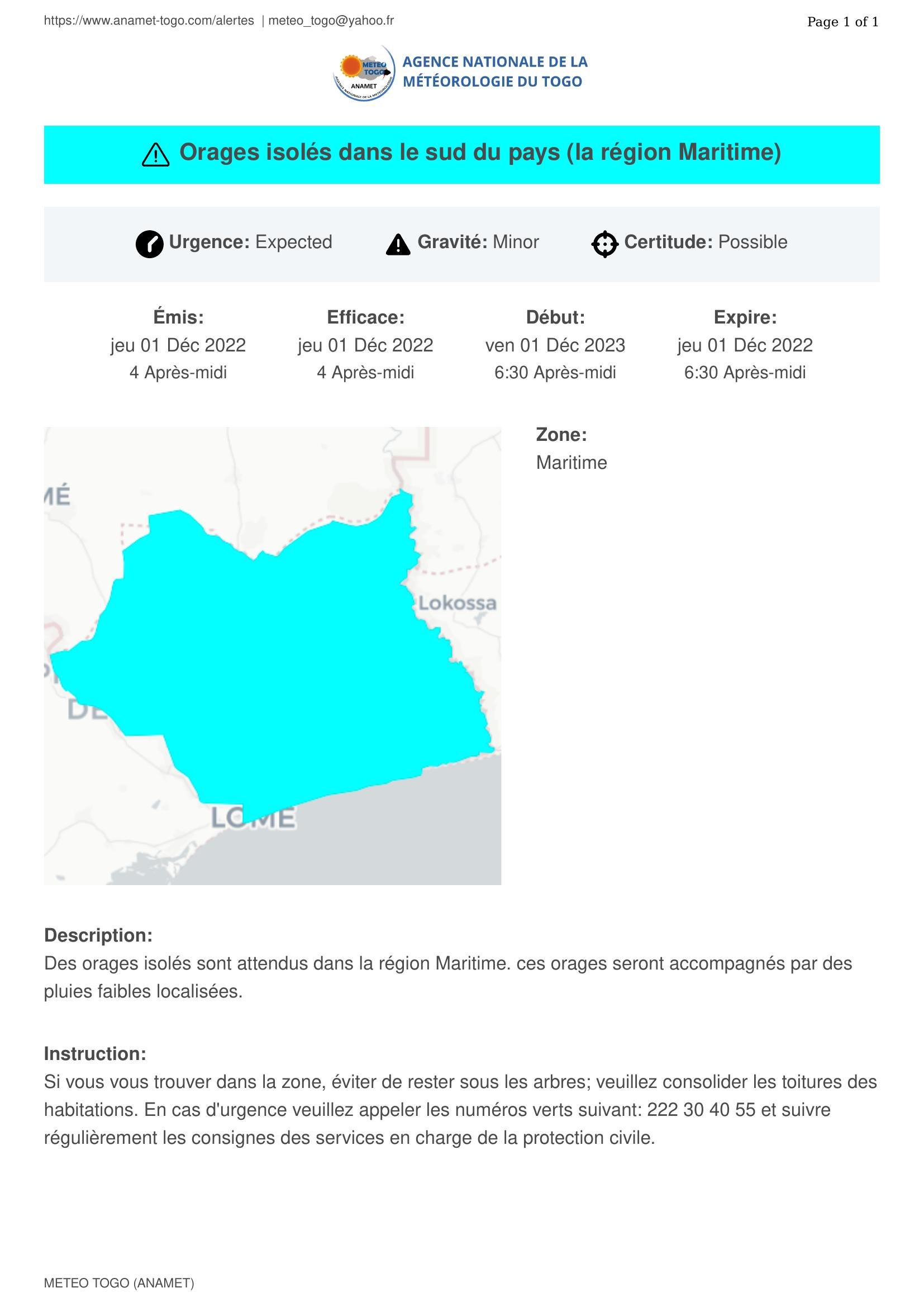 Des orages isolés sont attendus dans la région Maritime. ces orages seront accompagnés par des pluies faibles localisées.