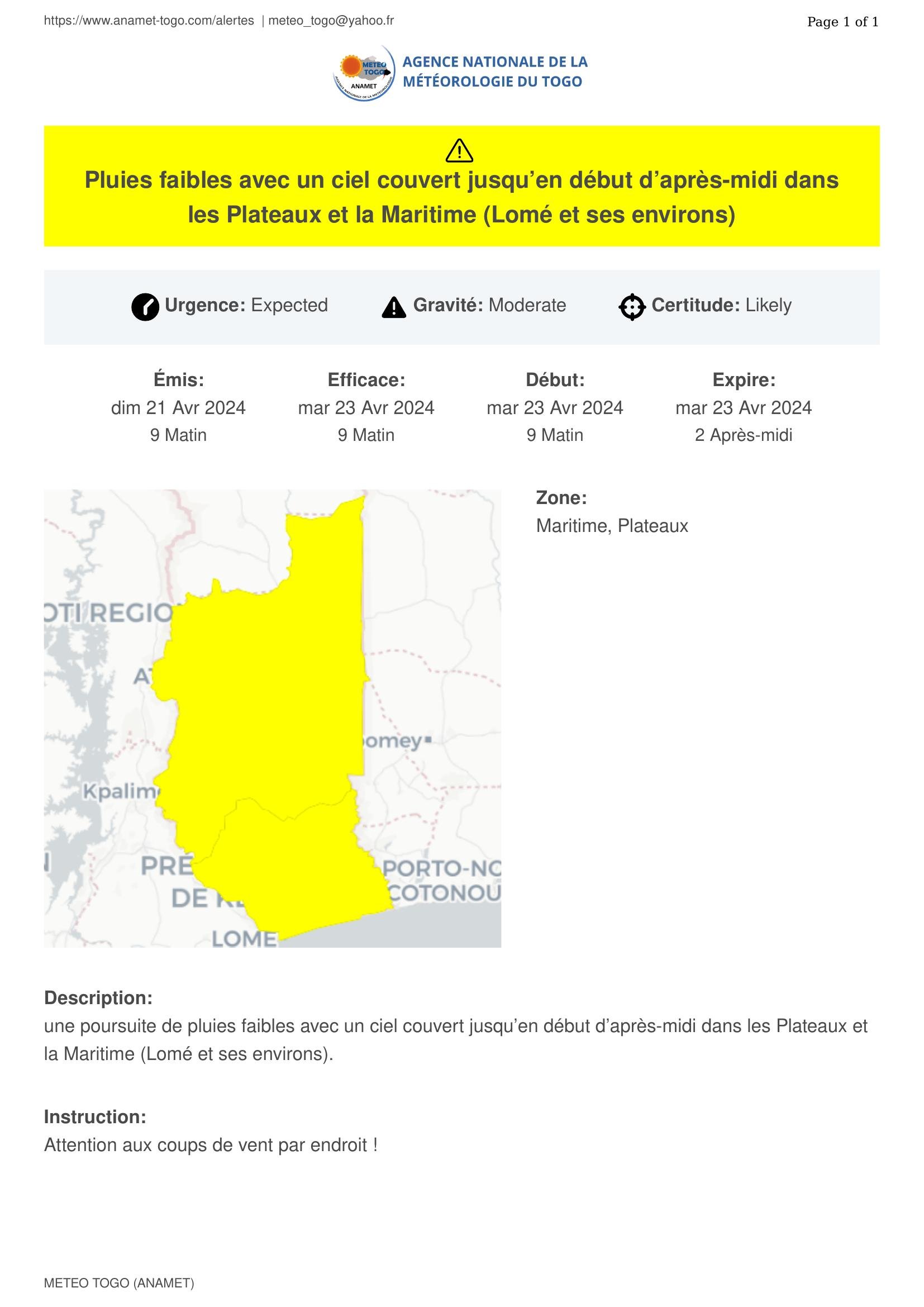 une poursuite de pluies faibles avec un ciel couvert jusqu’en début d’après-midi dans les Plateaux et la Maritime (Lomé et ses environs).