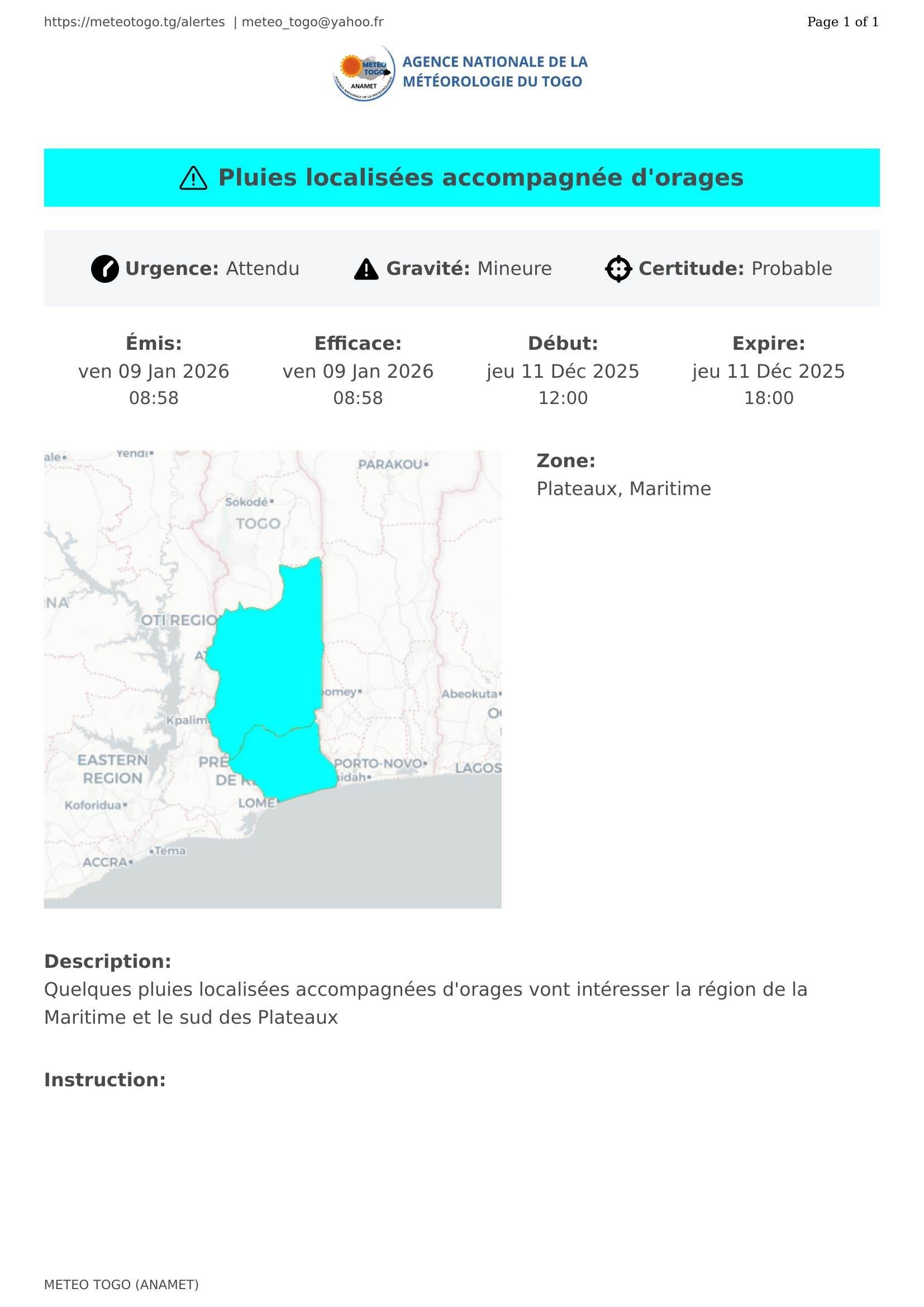 Quelques pluies localisées accompagnées d'orages vont intéresser la région de la Maritime et le sud des Plateaux