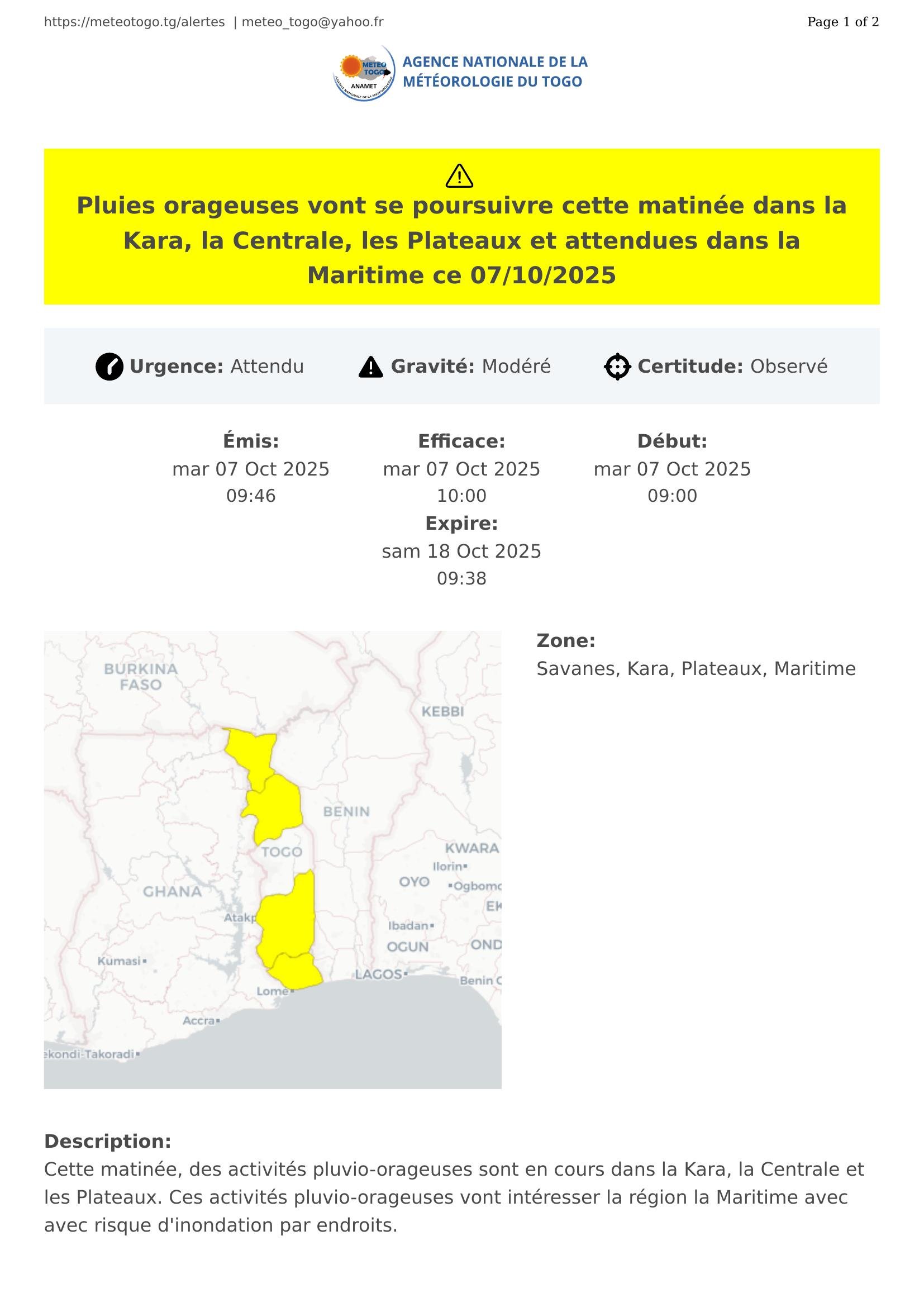 Pluies orageuses vont se poursuivre cette matinée dans la Kara, la Centrale, les Plateaux et attendues dans la Maritime ce 07/10/2025