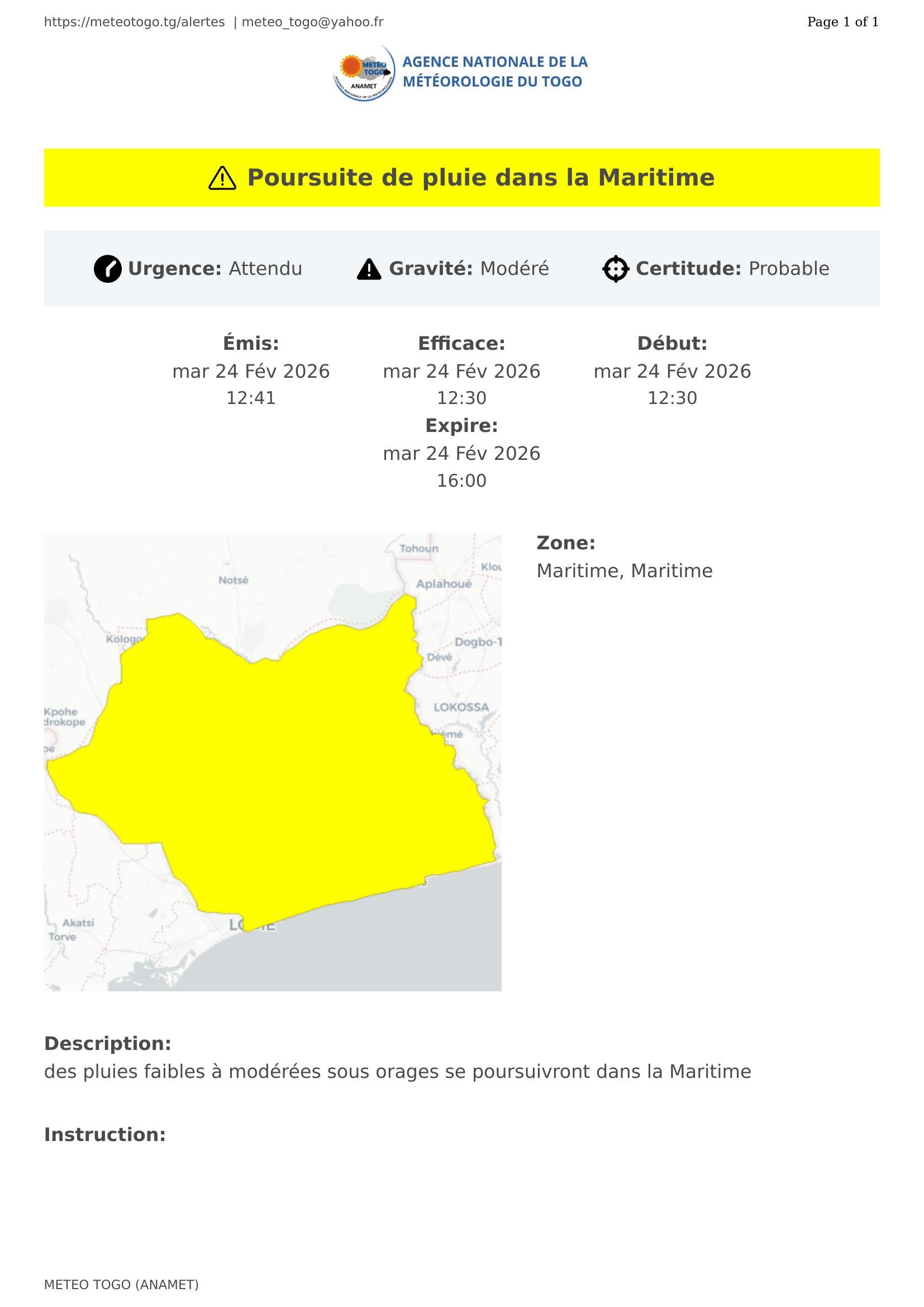 des pluies faibles à modérées sous orages se poursuivront dans la Maritime