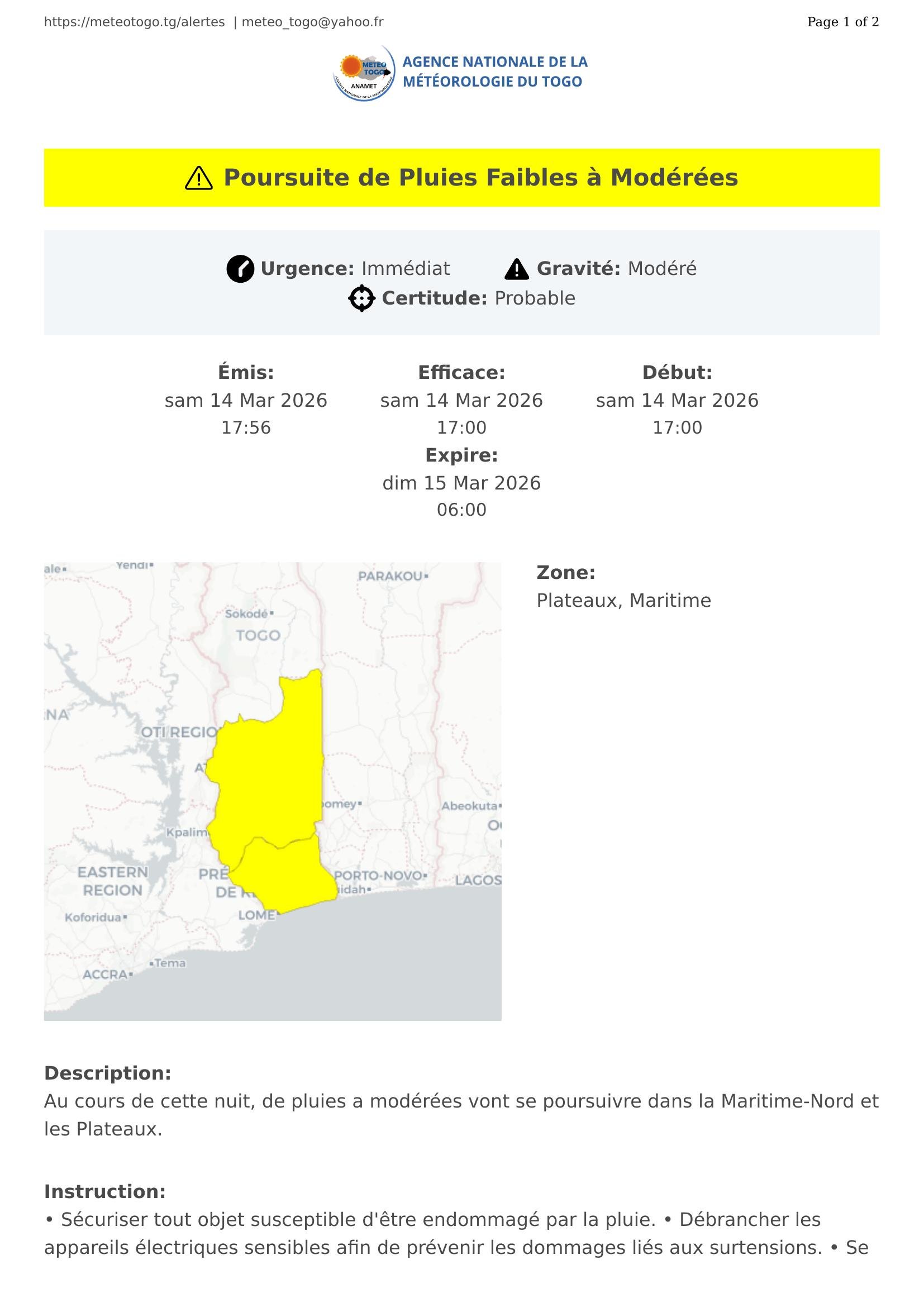 Au cours de cette nuit, de pluies a modérées vont se poursuivre dans la Maritime-Nord et les Plateaux.