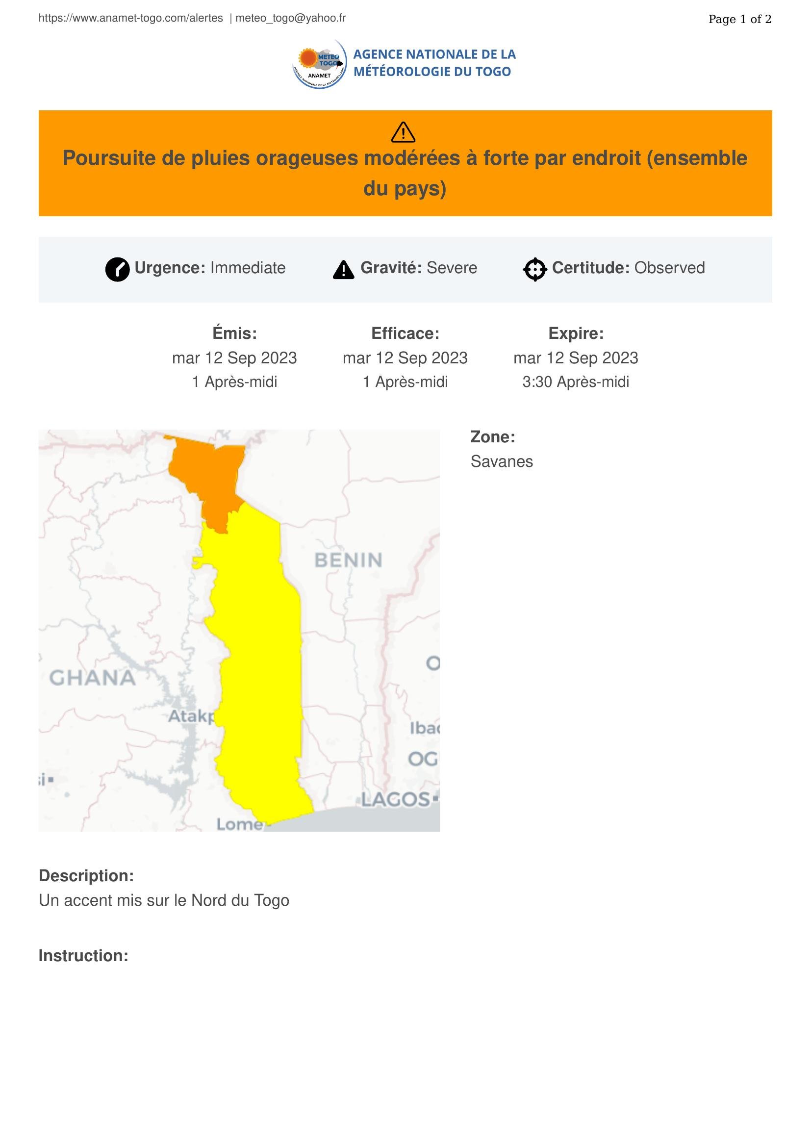 Des pluies orageuses modérées à fortes vont se pousuivre sur l'ensemble du pays avec un accent sur les régions Nord du pays.
