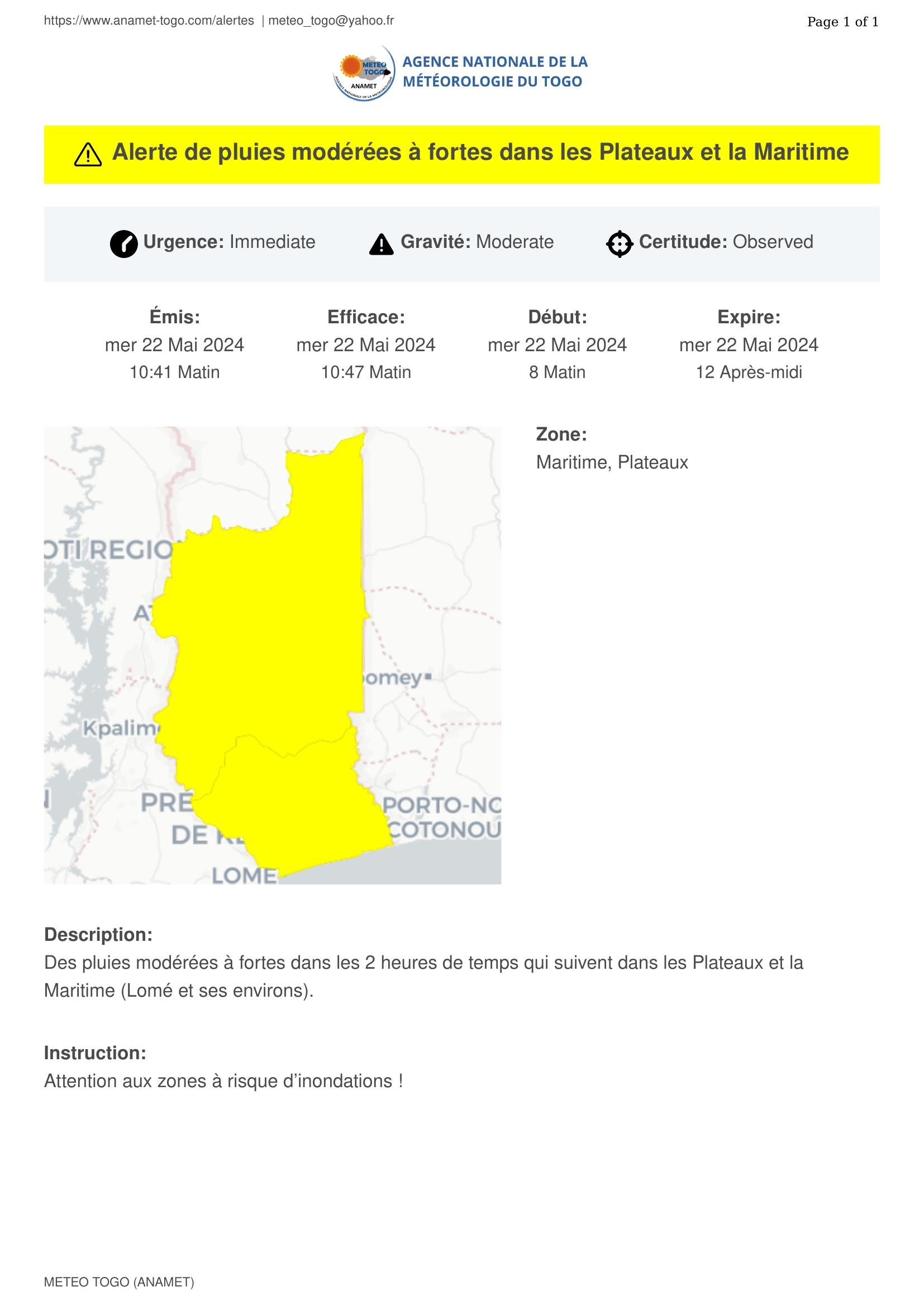 Des pluies modérées à fortes dans les 2 heures de temps qui suivent dans les Plateaux et la Maritime (Lomé et ses environs).