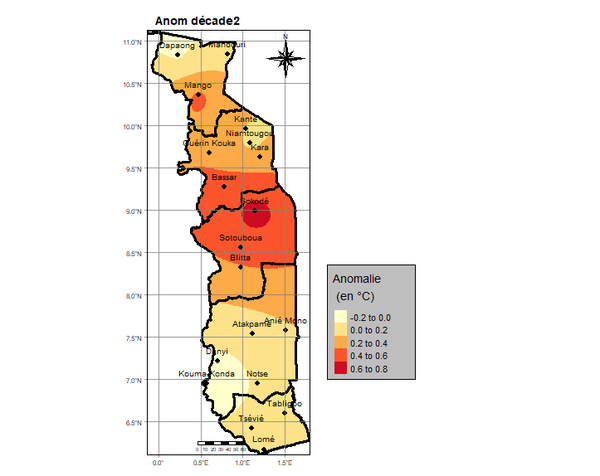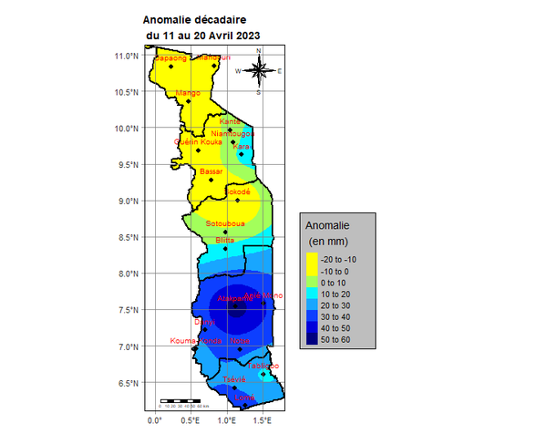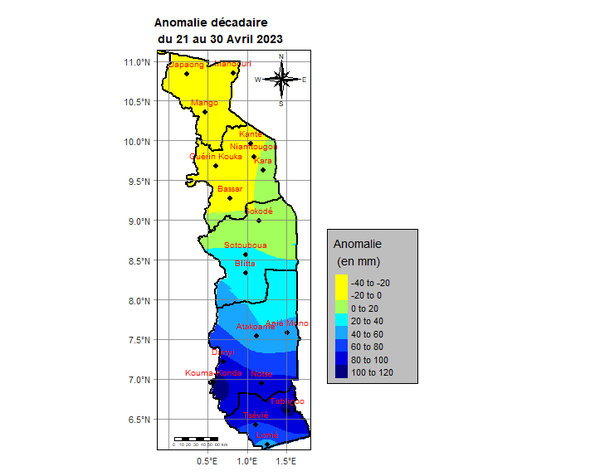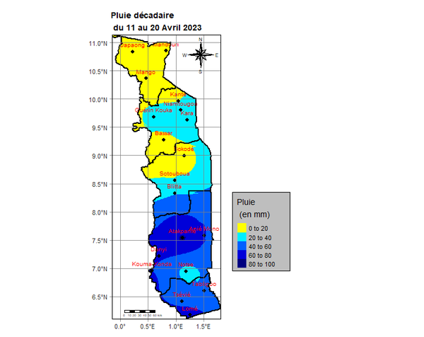 L’analyse montre que la deuxième décade est marquée par des pluies sur l’ensemble du pays. Elles ont varié de 6,5 mm à Sokodé en deux (2) jours à 106,7 mm à Atakpamé en cinq (5) jours. Les régions des Plateaux et Maritime sont les zones les plus arrosées.