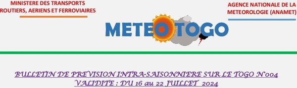 Semaine 1 (16 au 22 juillet) Période humide Le 16 et 17 juillet, des activités pluvio-orageuses sont attendues dans la Centrale, la Kara et les Savanes. Le 18 juillet, des activités pluvio-orageuses sont attendues dans toutes les régions du pays. Le 20 et 21 juillet, des manifestations pluvio-orageuses intéresseront l’ensemble du pays avec un accent sur le Nord qui seront marquées par le passage de l’onde d’est (OE12).