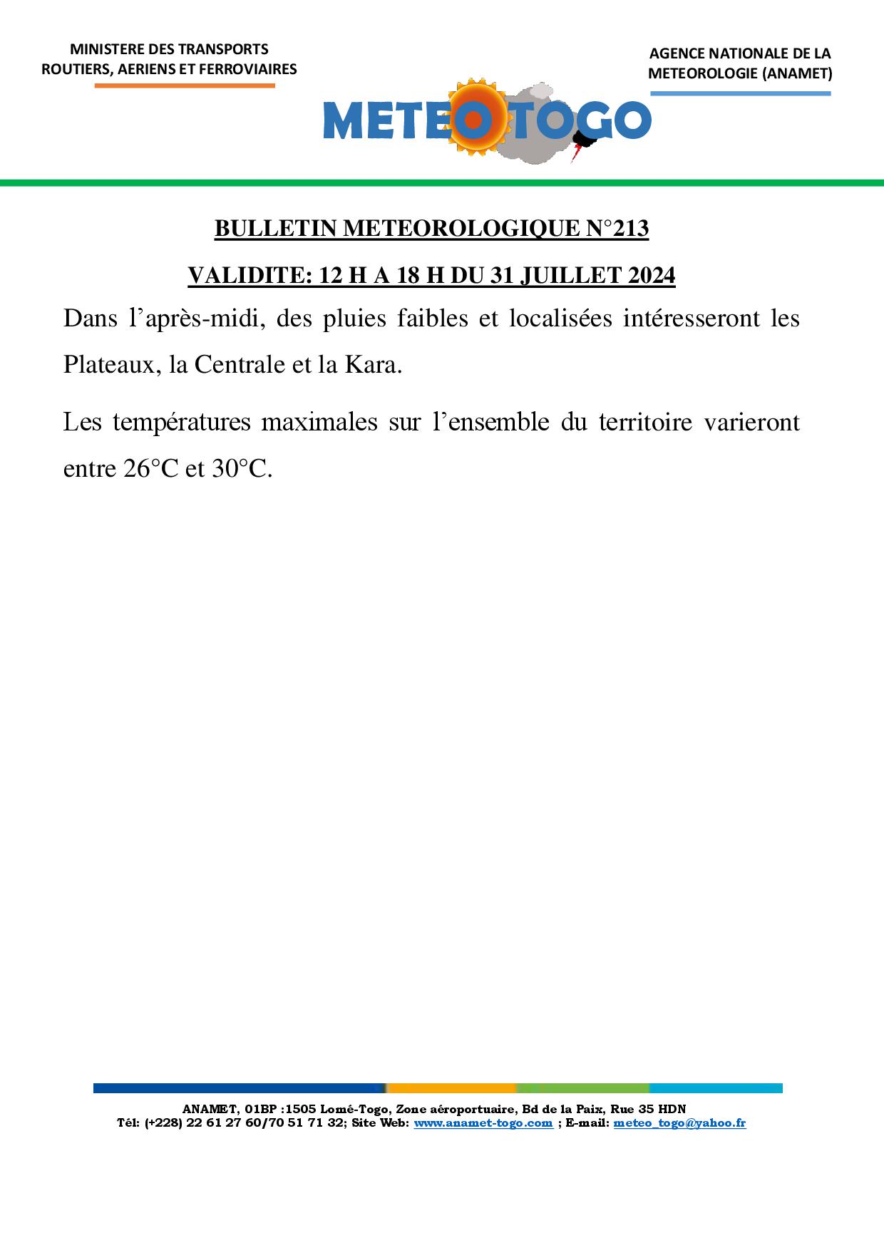 Dans l’après-midi, des pluies faibles et localisées intéresseront les Plateaux, la Centrale et la Kara. Les températures maximales sur l’ensemble du territoire varieront entre 26°C et 30°C.