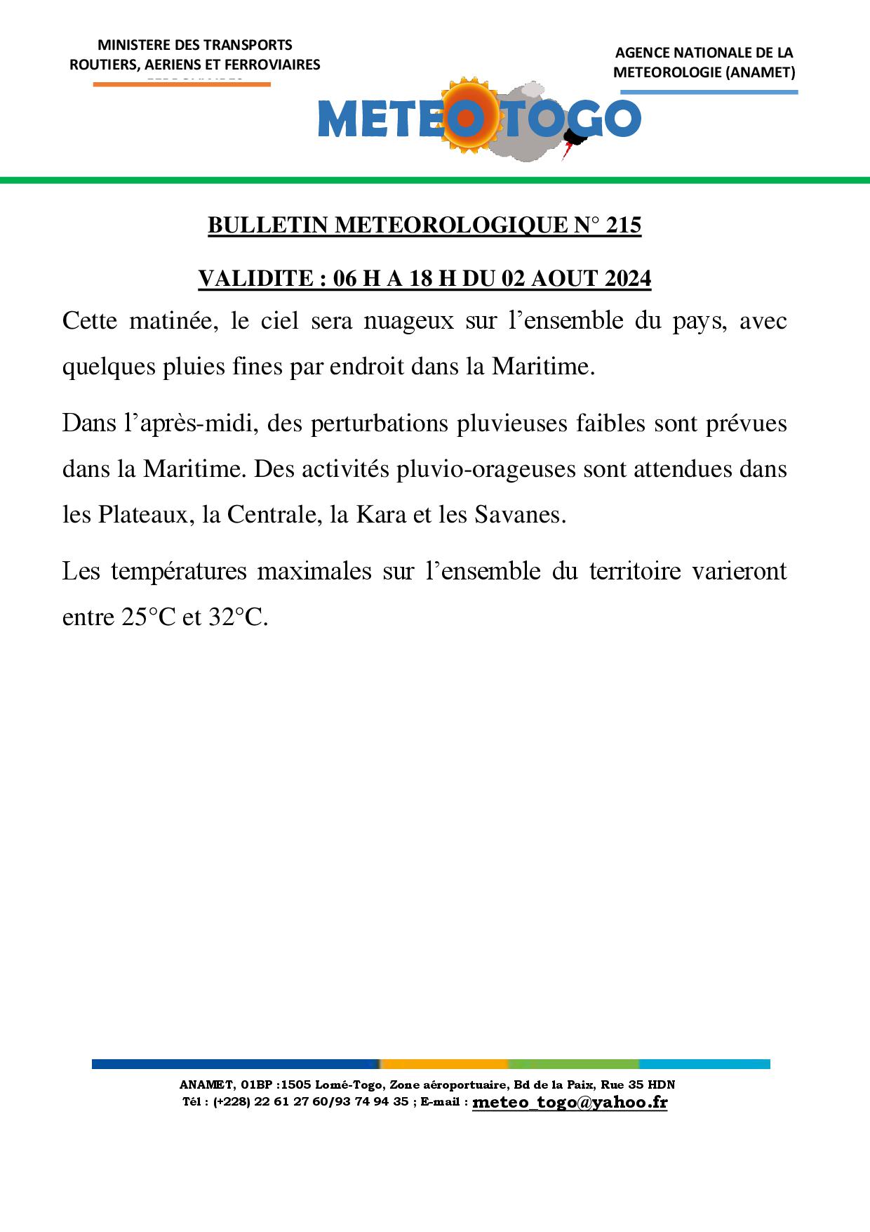 Dans l’après-midi, des perturbations pluvieuses faibles sont prévues dans la Maritime. Des activités pluvio-orageuses sont attendues dans les Plateaux, la Centrale, la Kara et les Savanes.