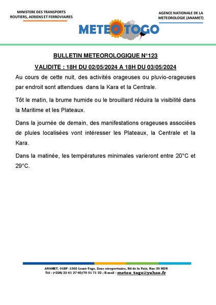 - Dans la journée de demain, des manifestations orageuses associées de pluies localisées vont intéresser les Plateaux, la Centrale et la Kara.