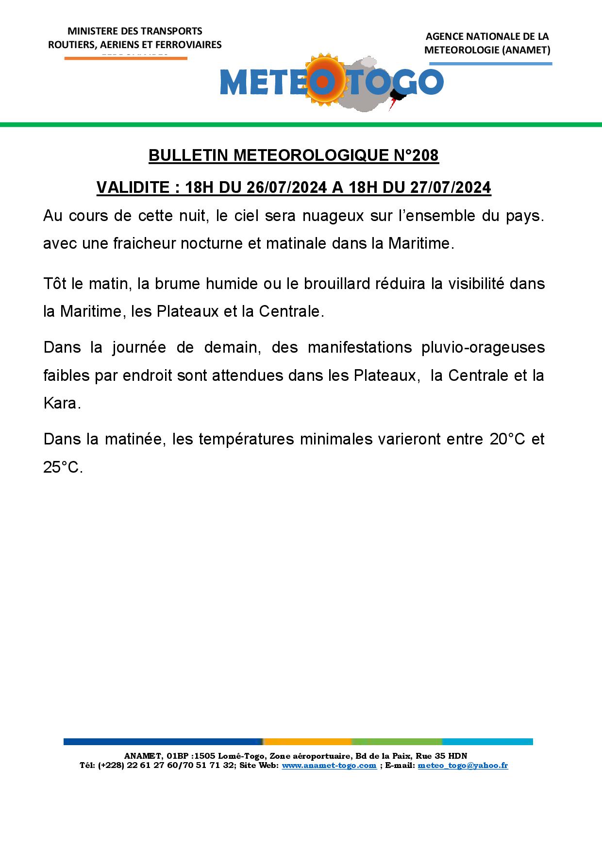 Au cours de cette nuit, le ciel sera nuageux sur l’ensemble du pays. avec une fraicheur nocturne et matinale dans la Maritime. Tôt le matin, la brume humide ou le brouillard réduira la visibilité dans la Maritime, les Plateaux et la Centrale. Dans la journée de demain, des manifestations pluvio-orageuses faibles par endroit sont attendues dans les Plateaux, la Centrale et la Kara. Dans la matinée, les températures minimales varieront entre 20°C et 25°C