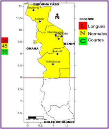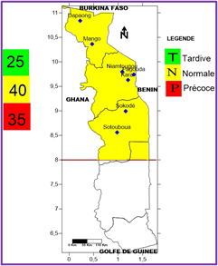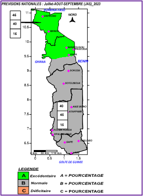 Au cours de la période de Juillet à septembre, tout le pays connaitra des précipitations normales à tendance excédentaire. Par contre dans les Savanes, et le nord de la Kara on aura des pluies excédentaires qui évolueront vers une situation normale