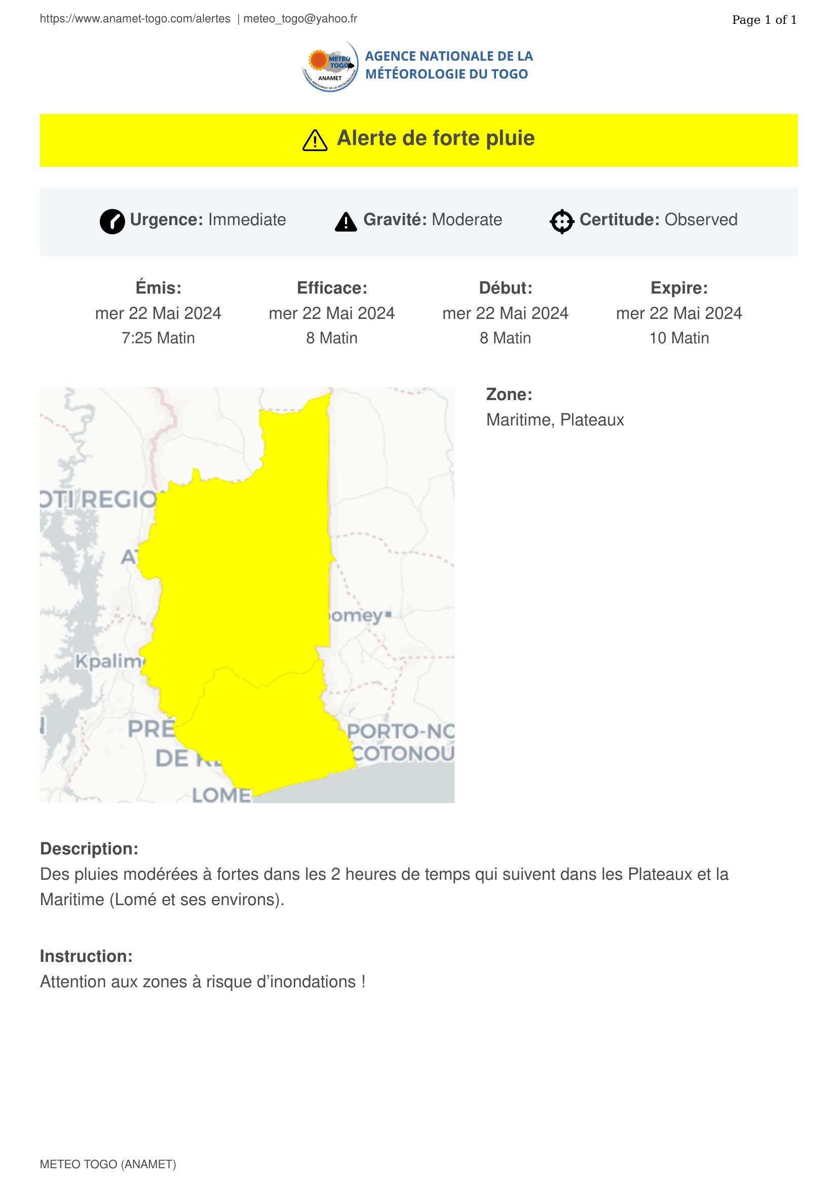 Des pluies modérées à fortes dans les 2 heures de temps qui suivent dans les Plateaux et la Maritime (Lomé et ses environs).