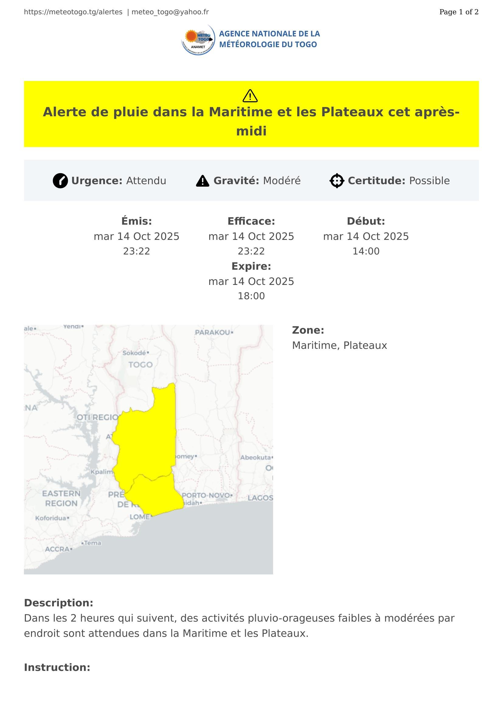 Alerte de pluie dans la Maritime et les Plateaux cet après-midi
