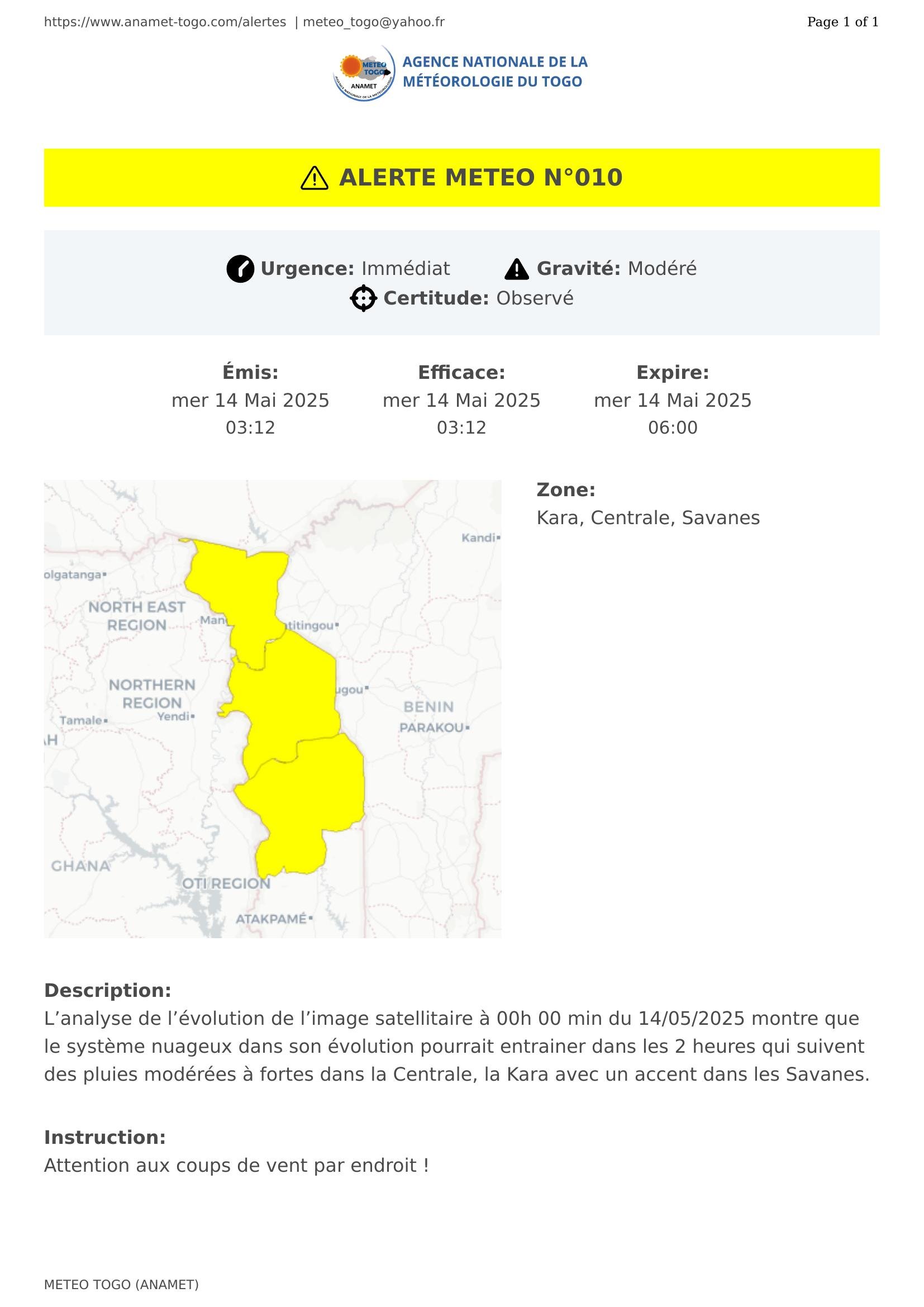 L’analyse de l’évolution de l’image satellitaire à 00h 00 min du 14/05/2025 montre que le système nuageux dans son évolution pourrait entrainer dans les 2 heures qui suivent des pluies modérées à fortes dans la Centrale, la Kara avec un accent dans les Savanes.