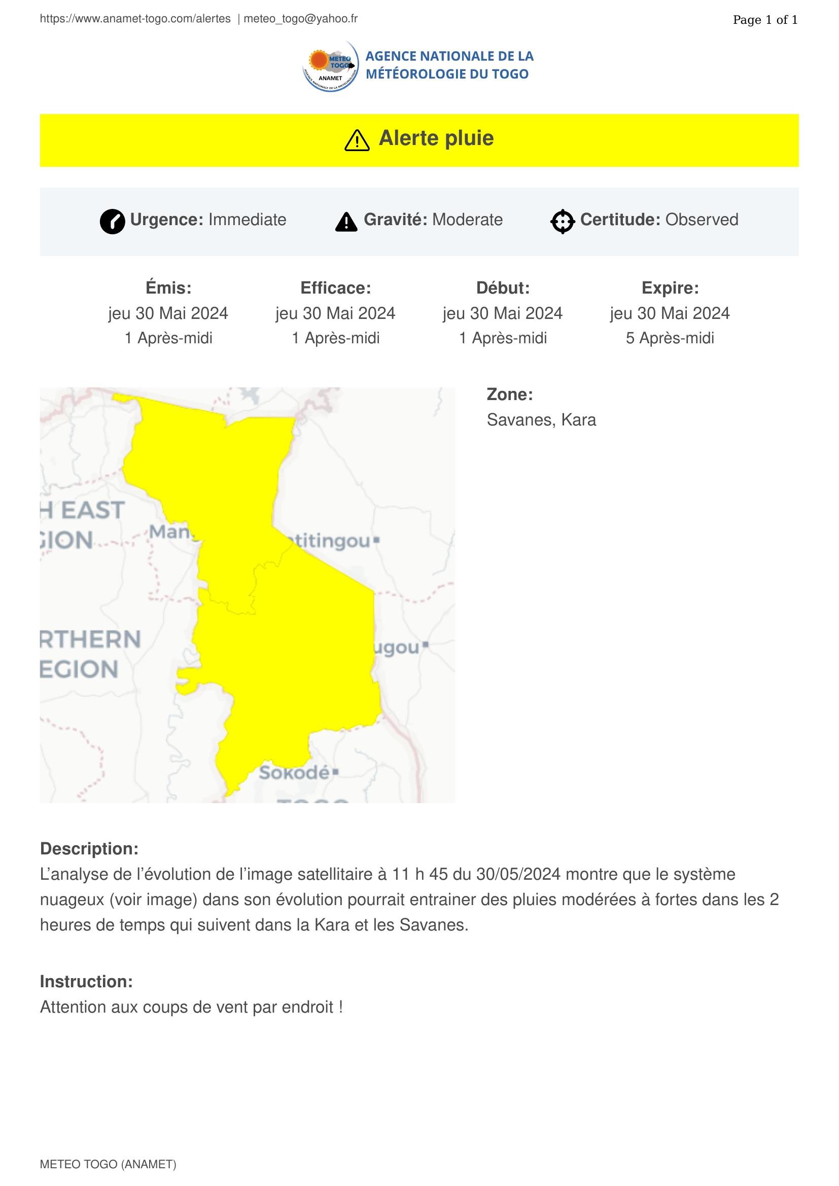 L’analyse de l’évolution de l’image satellitaire à 11 h 45 du 30/05/2024 montre que le système nuageux (voir image) dans son évolution pourrait entrainer des pluies modérées à fortes dans les 2 heures de temps qui suivent dans la Kara et les Savanes.