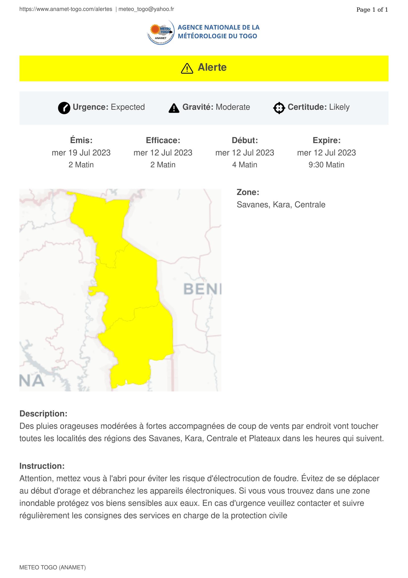 Des pluies orageuses modérées à fortes accompagnées de coup de vents par endroit vont toucher toutes les localités des régions des Savanes, Kara, Centrale et Plateaux dans les heures qui suivent.