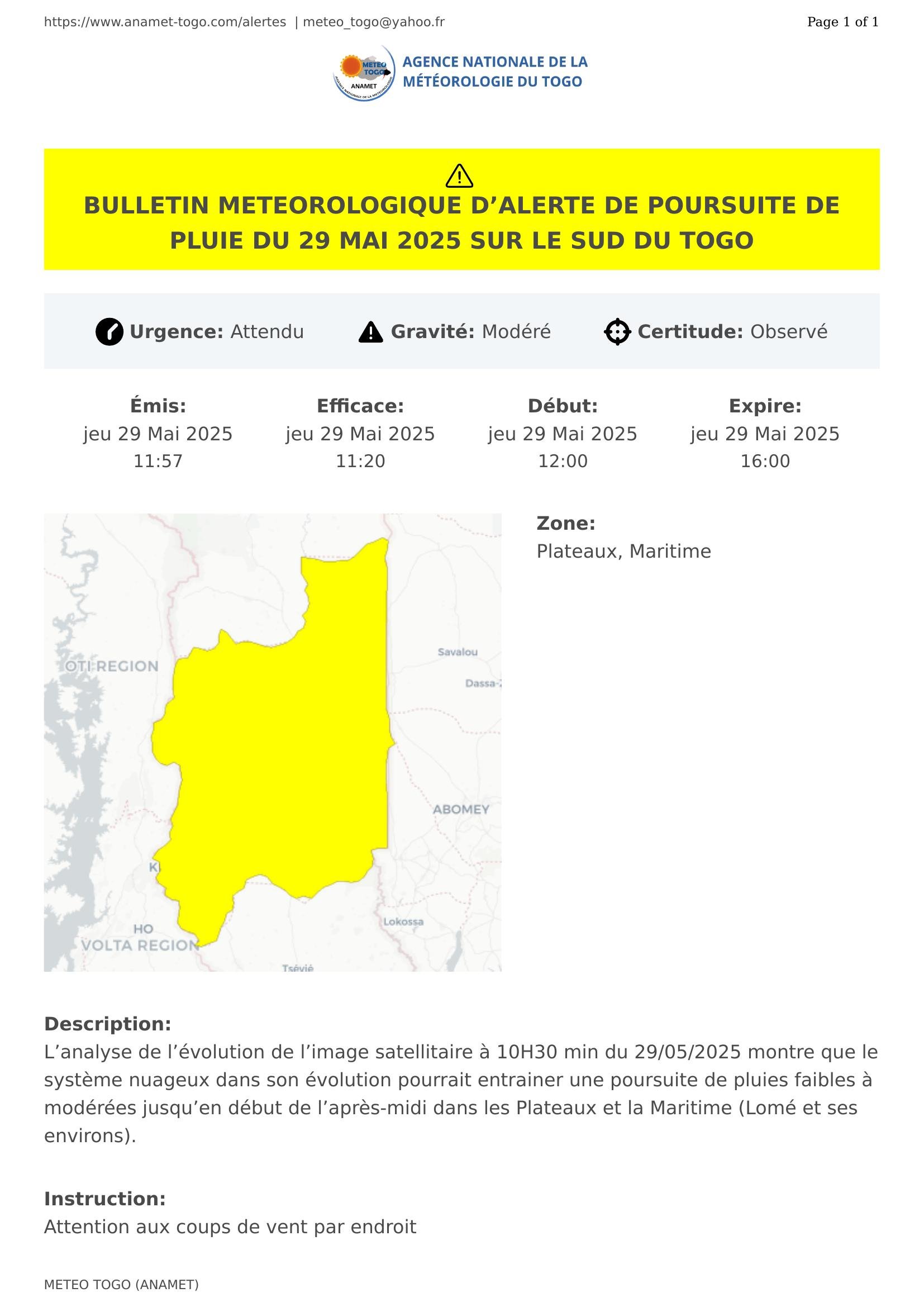BULLETIN METEOROLOGIQUE D’ALERTE DE POURSUITE DE PLUIE DU 29 MAI 2025 SUR LE SUD DU TOGO
