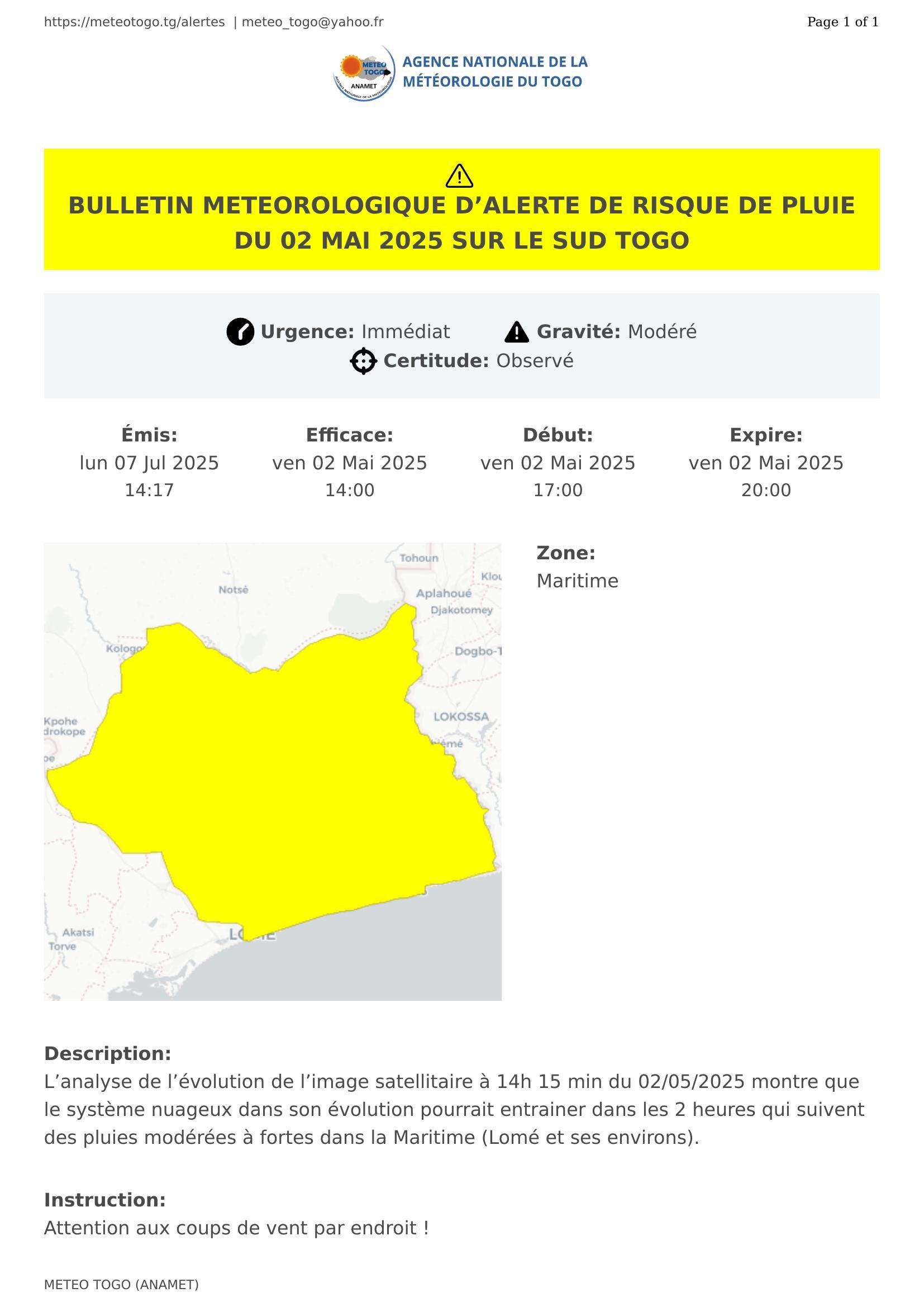 BULLETIN METEOROLOGIQUE D’ALERTE DE RISQUE DE PLUIE DU 02 MAI 2025 SUR LE SUD TOGO