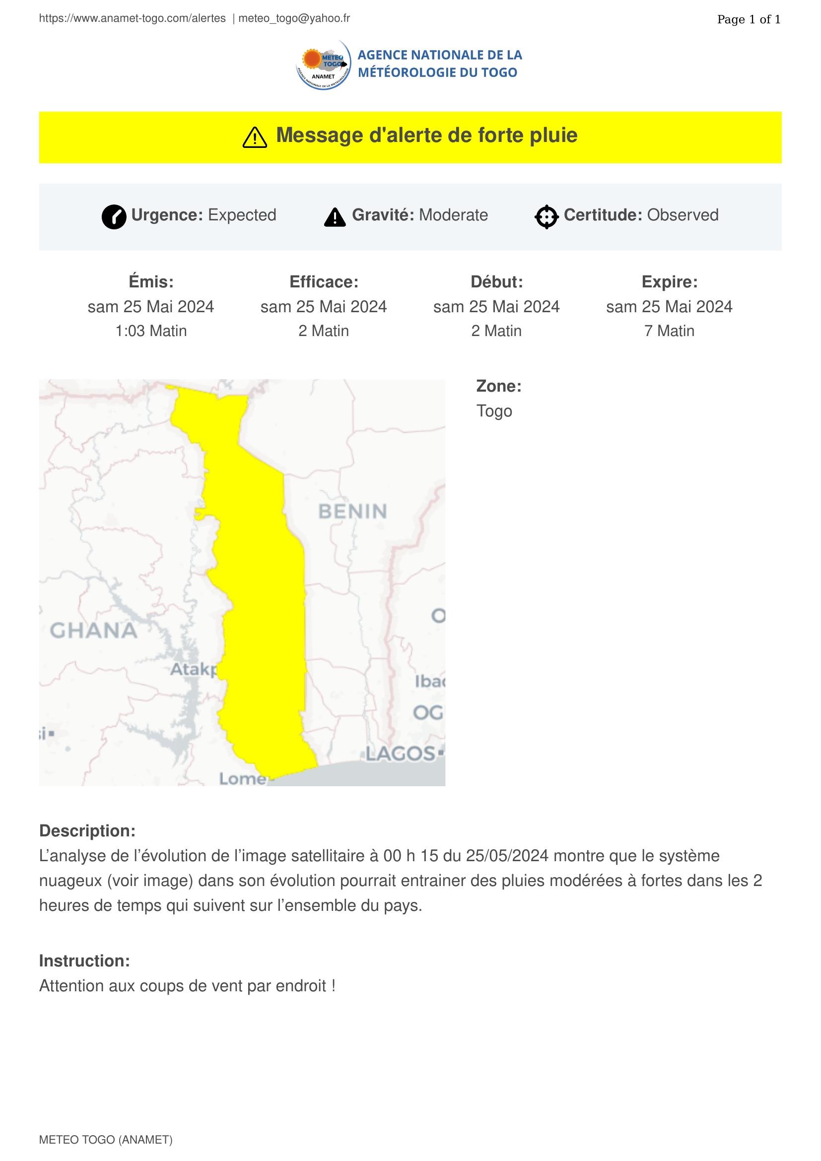 L’analyse de l’évolution de l’image satellitaire à 00 h 15 du 25/05/2024 montre que le système nuageux (voir image) dans son évolution pourrait entrainer des pluies modérées à fortes dans les 2 heures de temps qui suivent sur l’ensemble du pays.