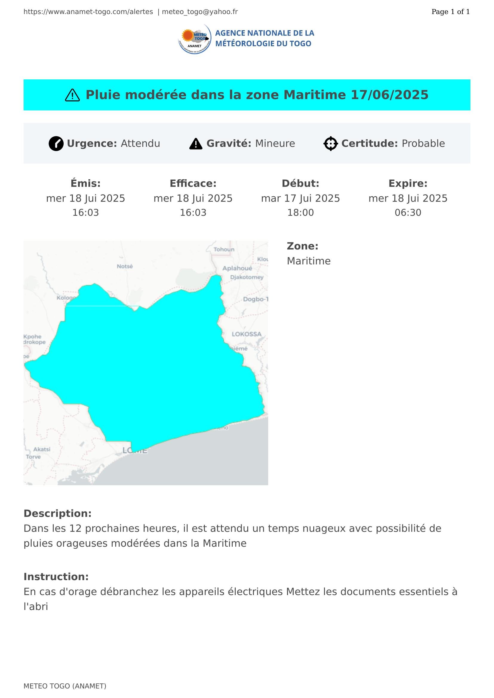 Dans les 12 prochaines heures, il est attendu un temps nuageux avec possibilité de pluies orageuses modérées dans la Maritime