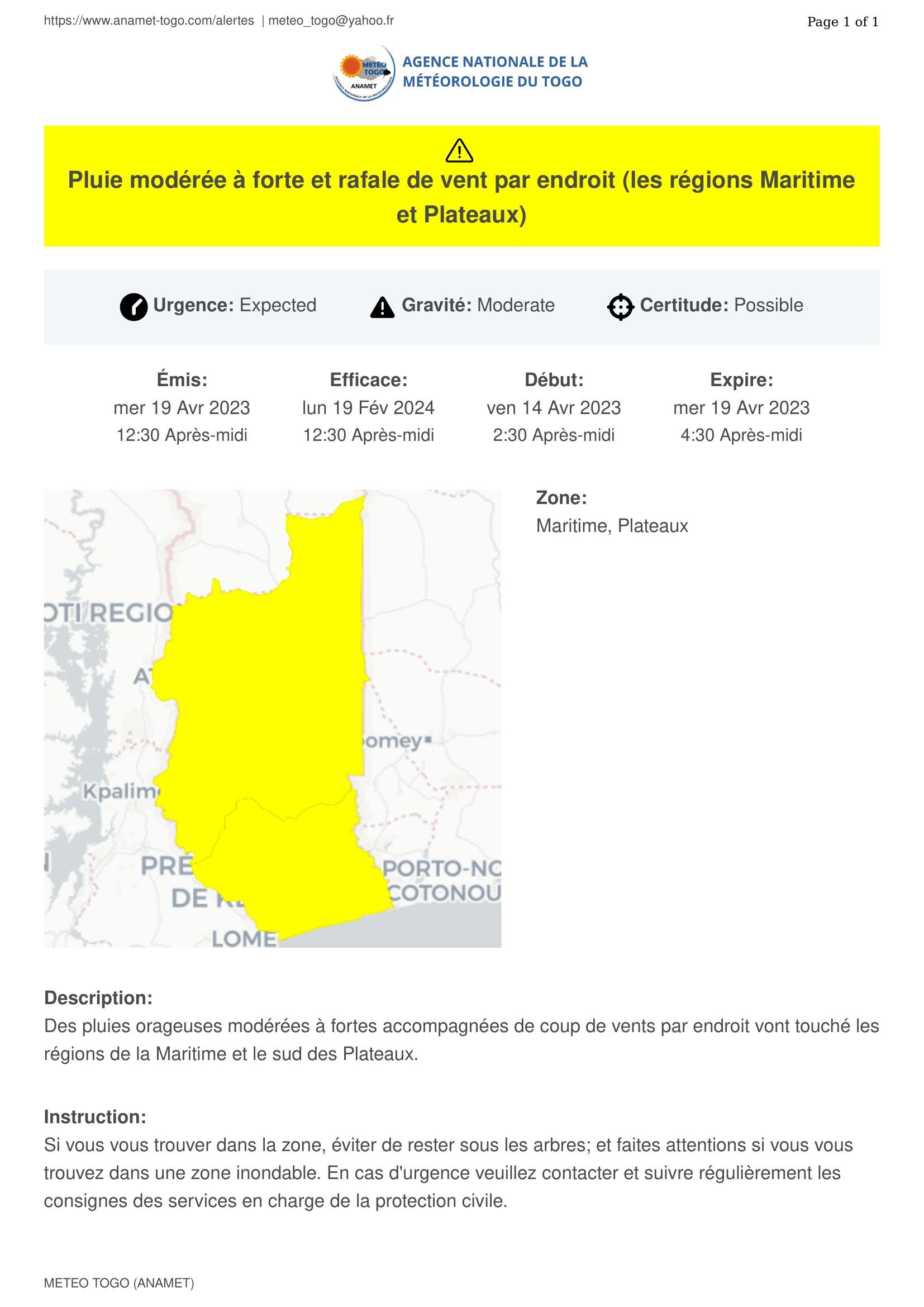 Pluie modérée à forte et rafale de vent par endroit (les régions Maritime et Plateaux)