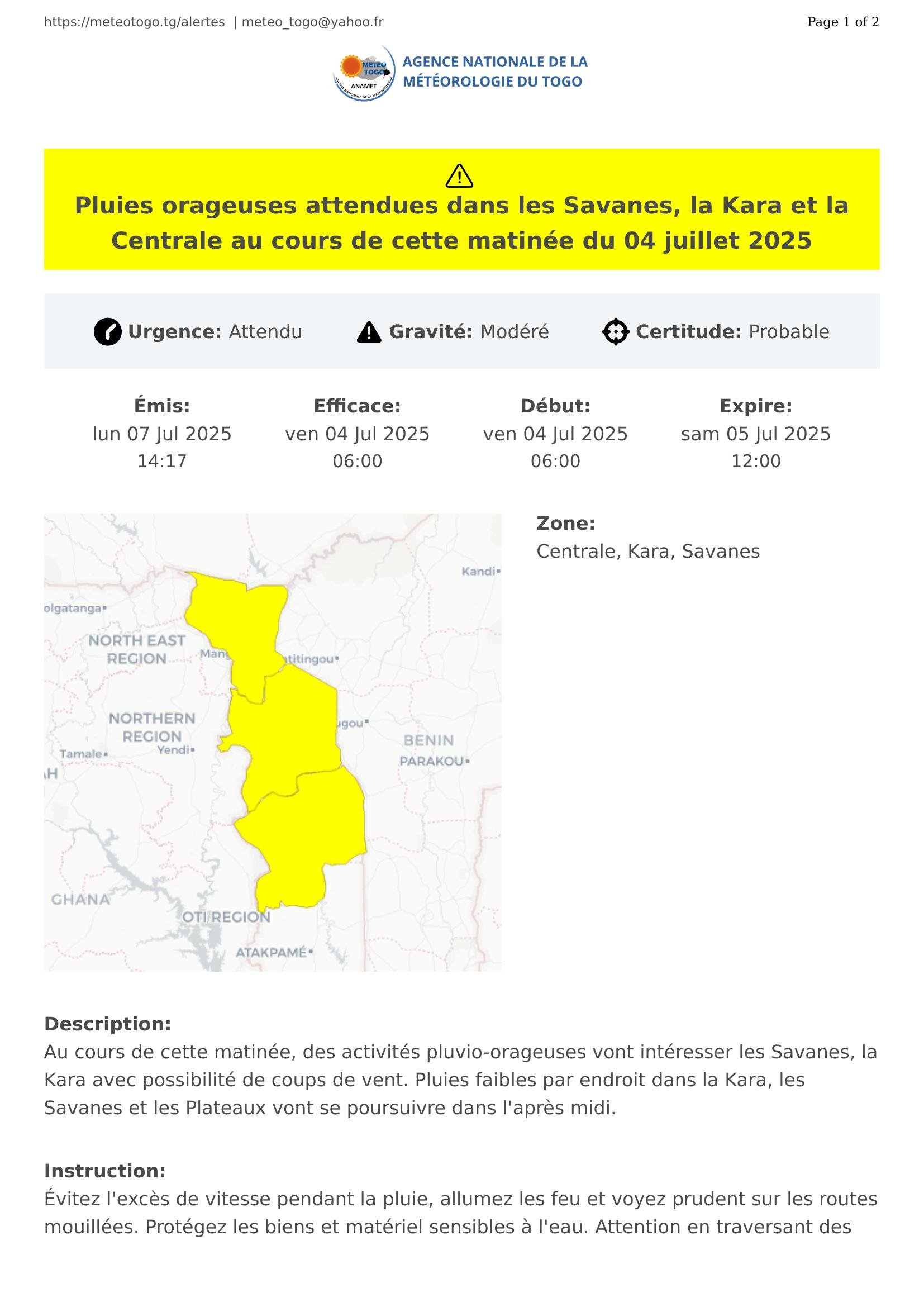 Pluies orageuses attendues dans les Savanes, la Kara et la Centrale au cours de cette matinée du 04 juillet 2025