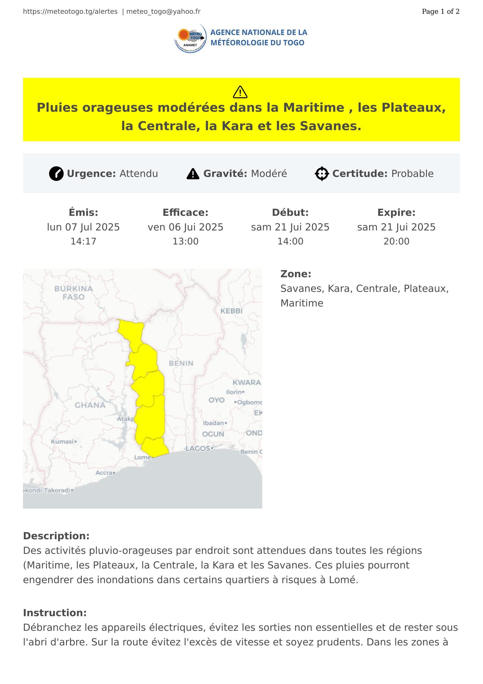 Des activités pluvio-orageuses par endroit sont attendues dans toutes les régions (Maritime, les Plateaux, la Centrale, la Kara et les Savanes. Ces pluies pourront engendrer des inondations dans certains quartiers à risques à Lomé.