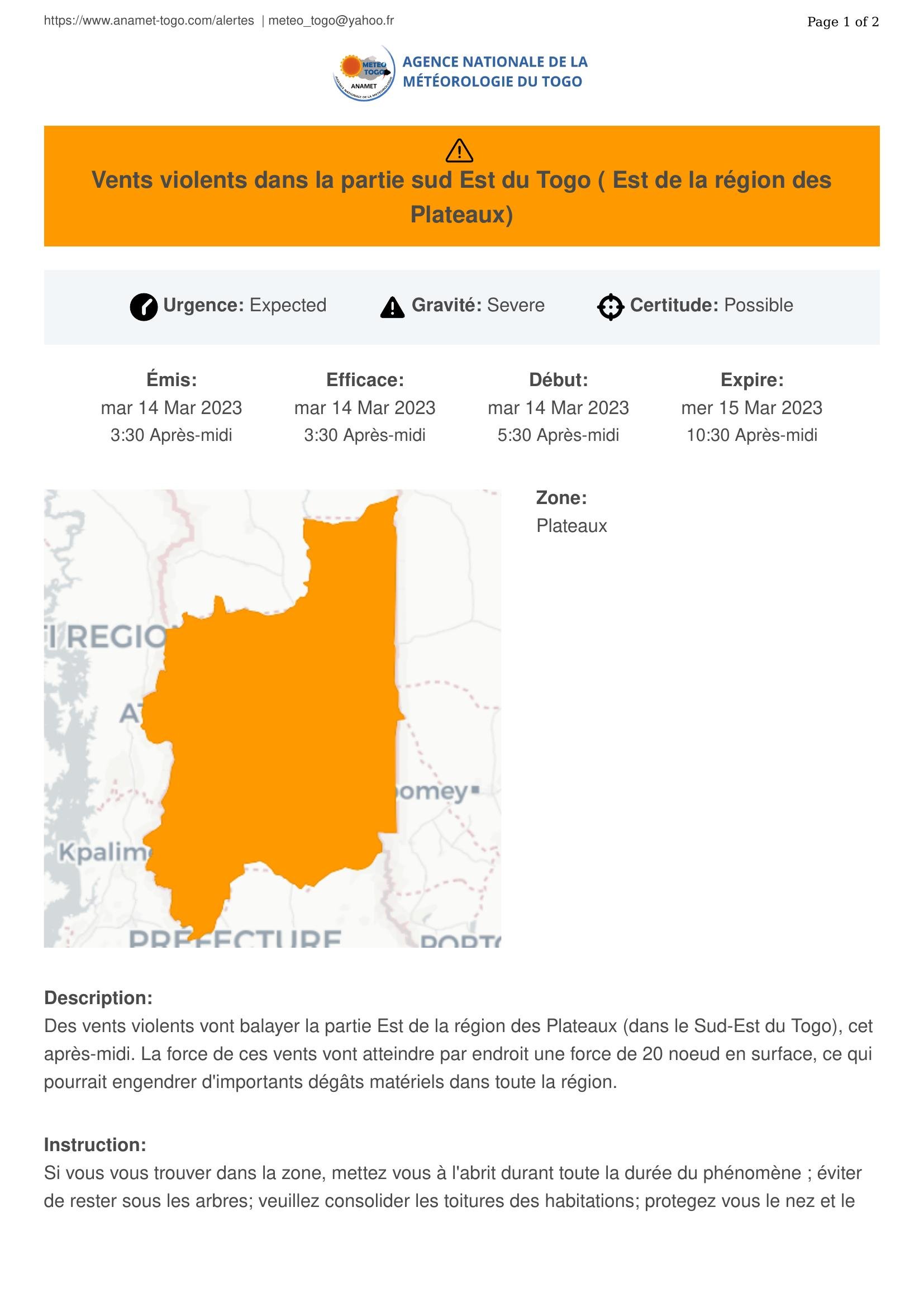 Des vents violents vont balayer la partie Est de la région des Plateaux (dans le Sud-Est du Togo), cet après-midi. La force de ces vents vont atteindre par endroit une force de 20 noeud en surface, ce qui pourrait engendrer d'importants dégâts matériels dans toute la région.