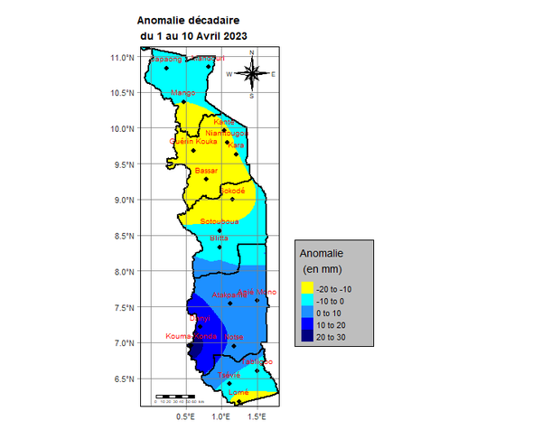 La première décade est marquée par des pluies localisées sur l’ensemble du pays. Elles ont varié de 1,0 mm à Niamtougou en un (1) jour à 82,6 mm à Kpalimé Tové en cinq (5) jours. L’analyse révèle que les régions Maritime et Plateaux sont les plus arrosées.