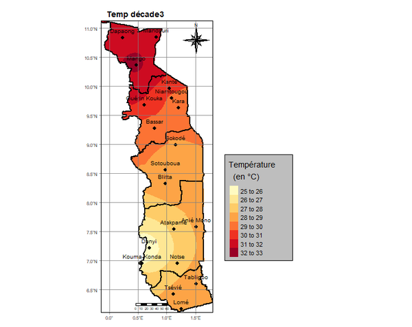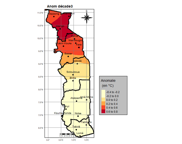 La troisième décade est caractérisée par des précipitations faibles à modérées sur l’ensemble du pays. Elles ont évolué entre 3,0 mm en un (1) jour à Dapaong et 182,4 mm à Kouma Konda en six (6) jours. Comme à la précédente décade, les régions des Plateaux et Maritime constituent les zones les plus arrosées au cours de la décade.