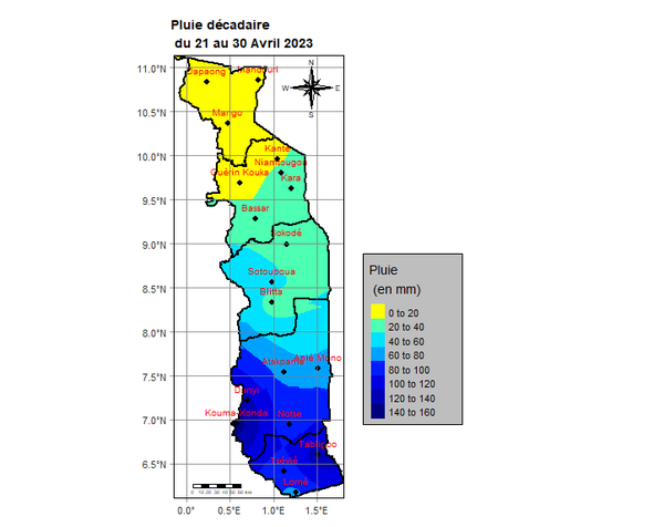 L’analyse montre que la deuxième décade est marquée par des pluies sur l’ensemble du pays. Elles ont varié de 6,5 mm à Sokodé en deux (2) jours à 106,7 mm à Atakpamé en cinq (5) jours. Les régions des Plateaux et Maritime sont les zones les plus arrosées.