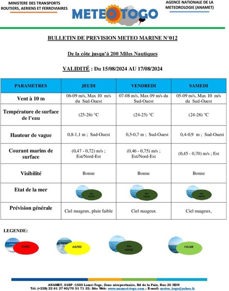 Bulletin de prévision marine du 15 au 17 Août 2024