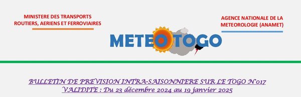 L’analyse des différents produits et paramètres issus de divers centres de prévision et des différents modèles concernant la zone tropicale, montre qu’une période sèche et poussiéreuse issue des vents du nord-est (Harmattan) sera observée sur l’ensemble du pays.