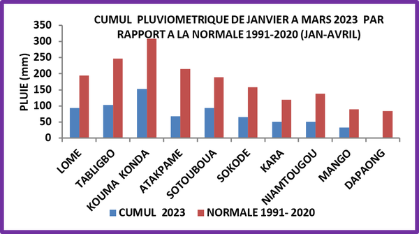 Considérant la période de janvier à mars et hormis Kouma Konda, Sokodé et Dapaong qui ont enregistré des excédents, l’année 2022 est déficitaire par rapport à la normale 1991-2020 dans les autres villes