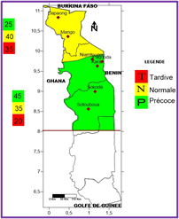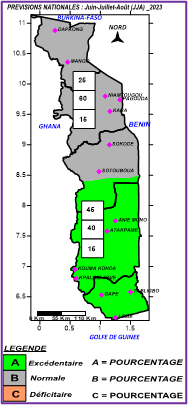 Au cours de la période de Juillet à septembre, tout le pays connaitra des précipitations normales à tendance excédentaire. Par contre dans les Savanes, et le nord de la Kara on aura des pluies excédentaires qui évolueront vers une situation normale