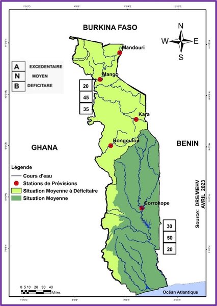 Les résultats de cette prévision 2023 au Togo donnent les évolutions probables des précipitations des saisons Juin à Août (JJA), Juillet à Septembre (JAS), les écoulements des cours d’eau de Juin à Septembre et les périodes de démarrage et de fin, ainsi que les séquences sèches en début et vers fin de la saison des pluies.