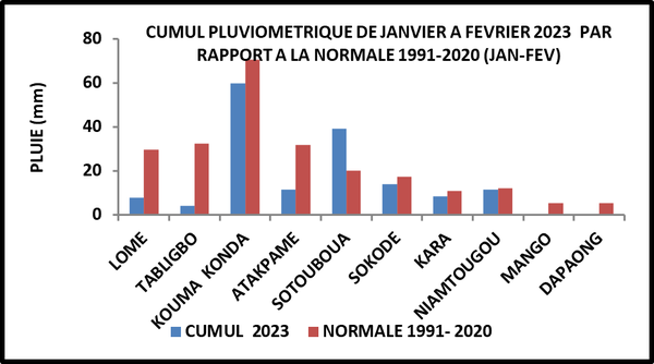 Considérant la période de janvier à février et hormis Sotouboua qui a enregistré un excédent, l’année 2023 est déficitaire par rapport à la normale 1991-2020 au Togo en termes de cumul national moyen