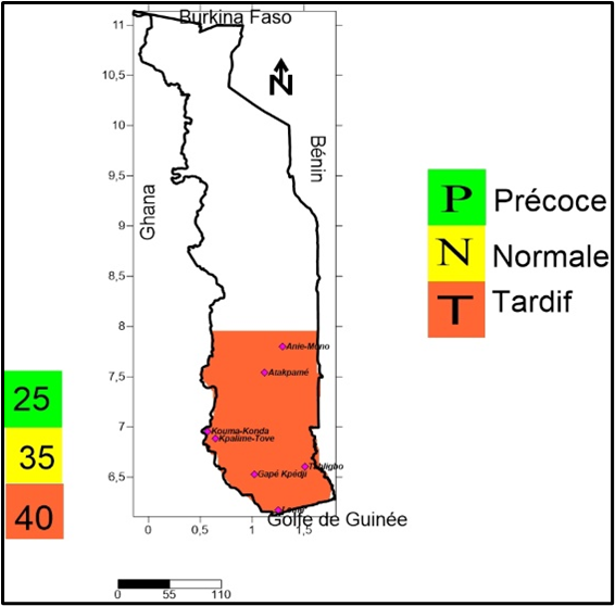 Les situations des cumuls pluviométriques globalement moyens, des dates de début de saison moyennes à tardives, des dates de fin de saison précoces à moyennes laissent planer des risques de déficits hydriques dans la zone bimodale (régions Maritime et Plateaux). Ces situations de sècheresse pourraient entraver la croissance des plantes et favoriser le développement d’insectes ravageurs des cultures.